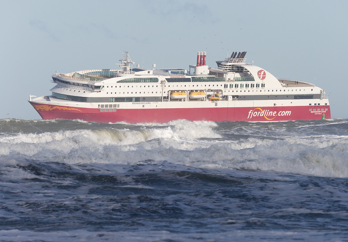 Already a couple of hours late BERGENSFJORD aborts her call at Hirtshals due to heavy winds from the storm Ingolf and return out into the North Sea. The Fjord Line ferry succeeded at a second attempt an hour later.
