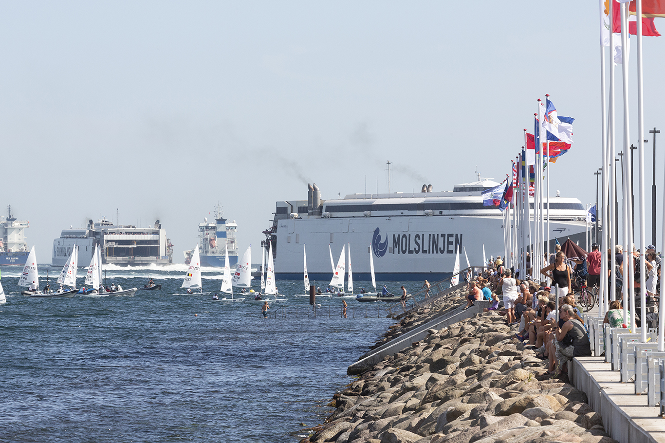 The Russian replica of Tsar Peter the Great’s SHTANDART and the beautiful newly renovated Danish training ship GEORG STAGE. I the distance, with Aarhus Ø as a background, Molslinjen’s EXPRESS 3 calls from Zeeland. Above: A dedicated traffic control centre has been set up to handle the meeting between commercial traffic and the world championship’s many participating sailboats. Molslinjen’s EXPRESS 1 and ‘EXPRESS 2 meets, while two container feeders just left the East Port. The long north-facing promenade at Aarhus Ø also acted as the main spectator area during the competitions.