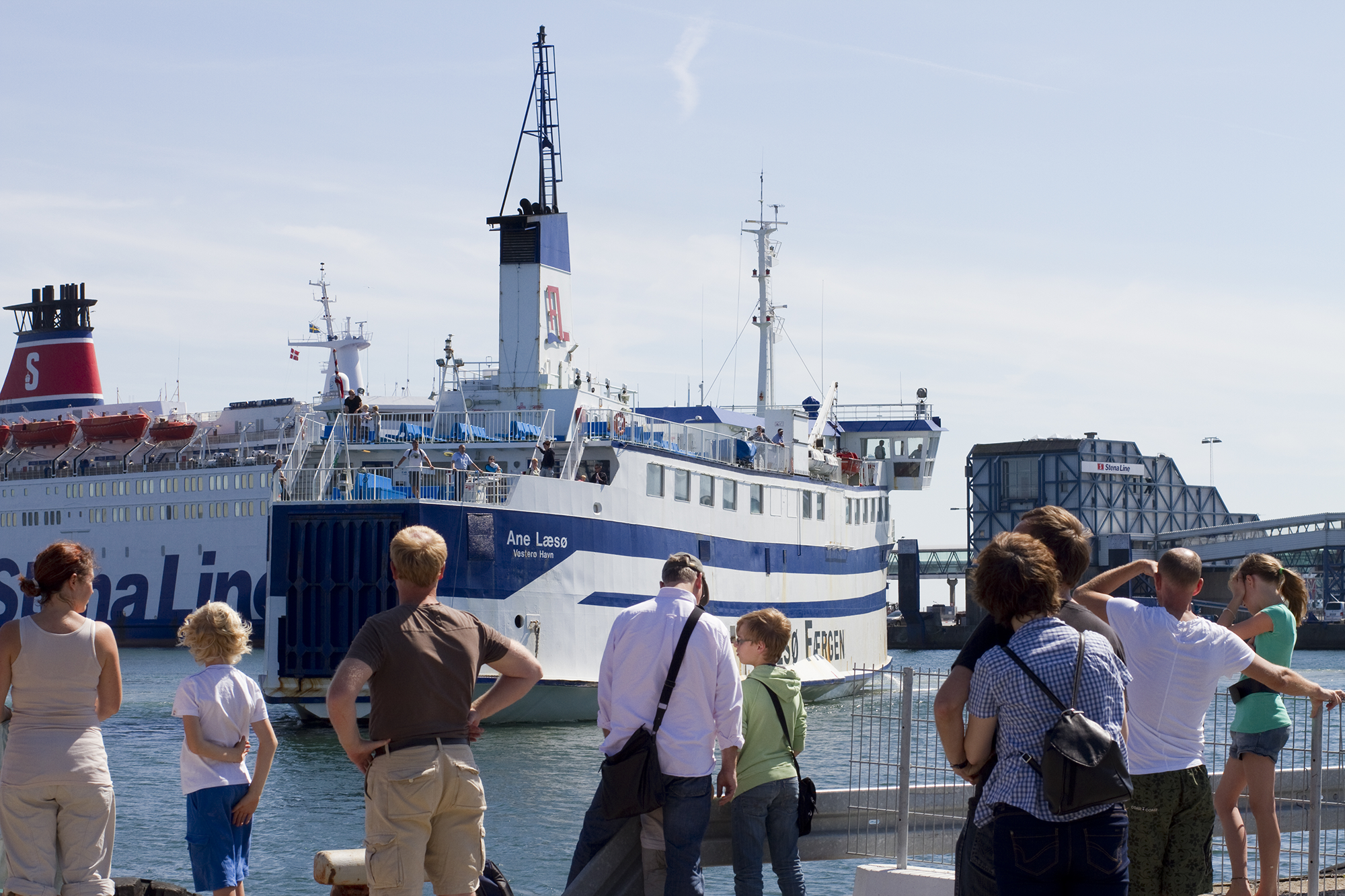 2011, July 30: A typical summer scene in the central ferry port, ANE LÆSØ (The previous one) manoeuvres with STENA DANICA in the background and with holidaymakers as an audience.