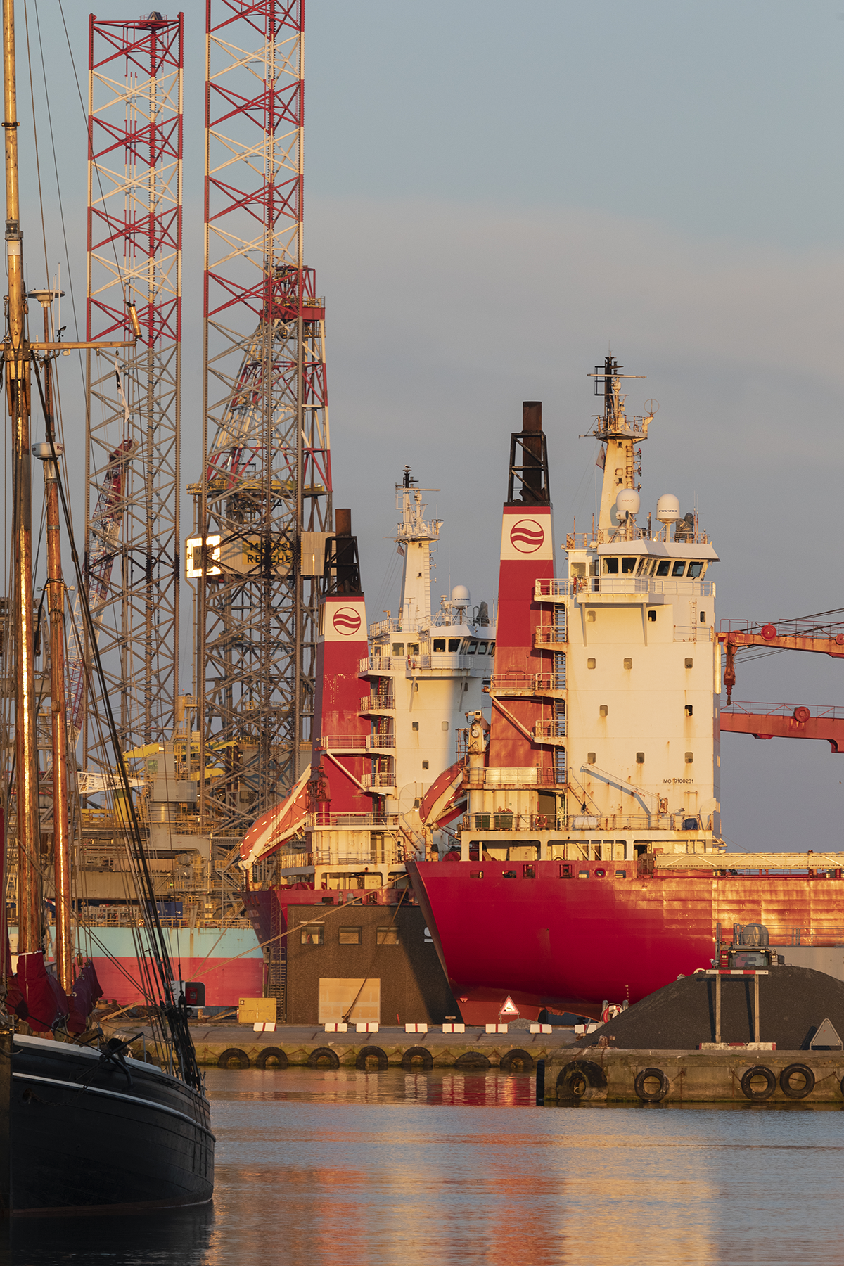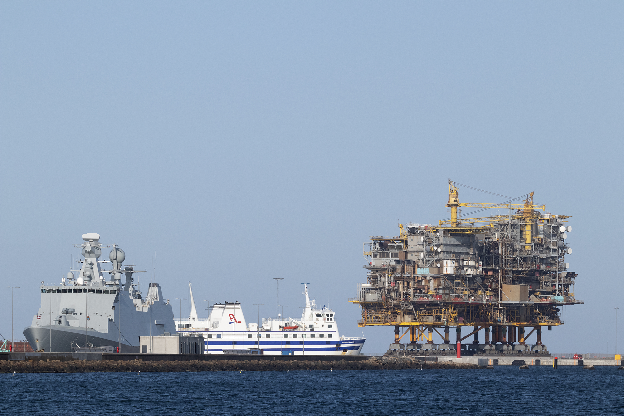 2020, September 18: The US-based M.A.R.S. (Modern American Recycling Services, Inc.), a steel recycling specialist, has established a huge site on a new-developed area in The Port of Frederikshavn. The first major task was the dismantling and recycling of two production sections from the Danish North Sea oilfield TYRA. Here a photo with the TYRA sections shot from the marina overviewing parts of the naval base and with the ferry MARGRETHE LÆSØ departing for Læsø.