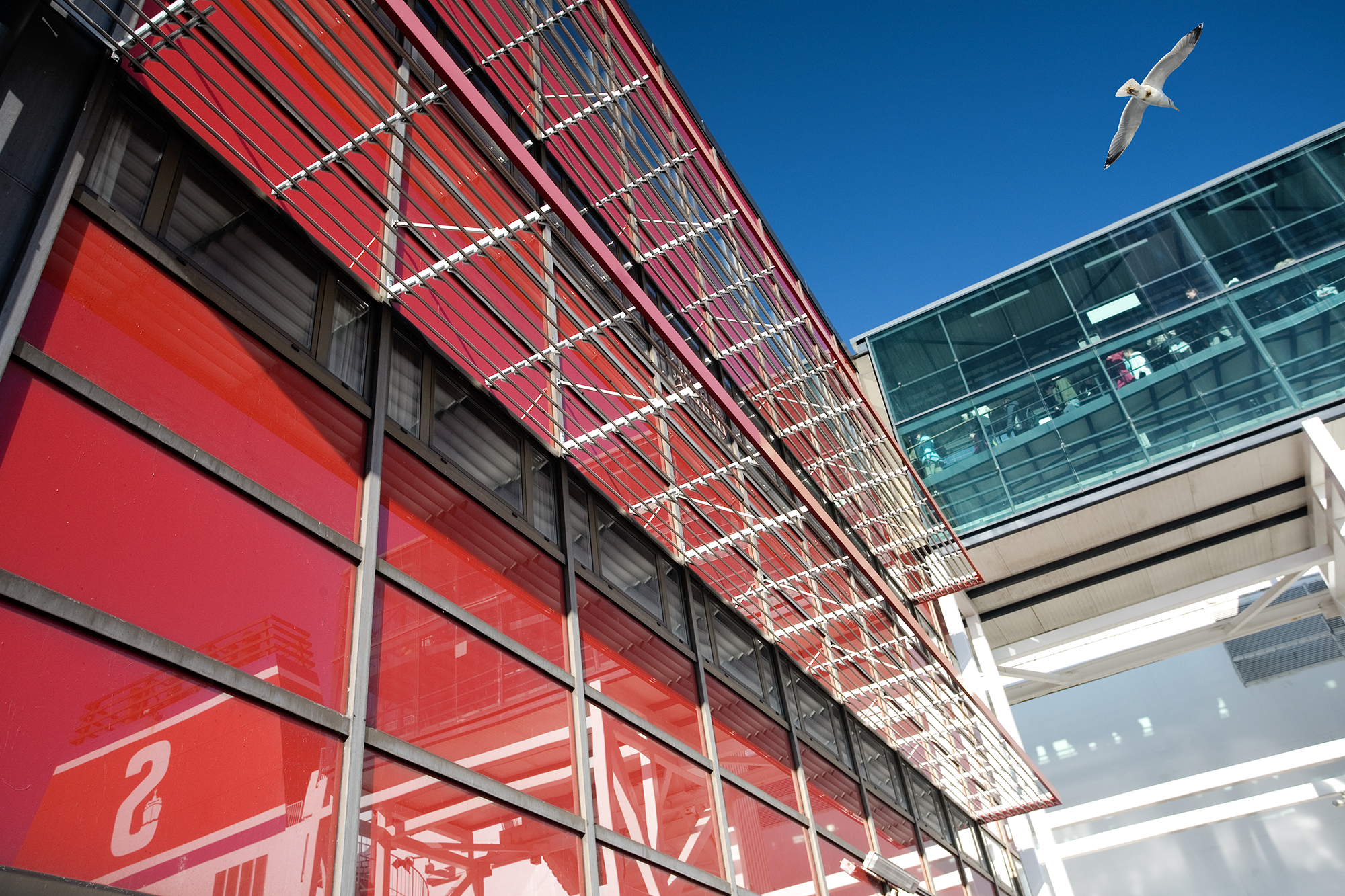 2009, February 14: STENA JUTLANDICA’s funnel reflected in the red facade of the Stena Terminal in Frederikshavn.